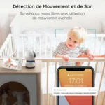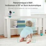 The camera’s PTZ functionality with 355° rotation ensures a wide viewing range, while motion detection with automatic tracking follows your baby’s movements to keep them centered in the frame. This intelligent monitoring helps parents stay aware of activity without constant manual adjustments.